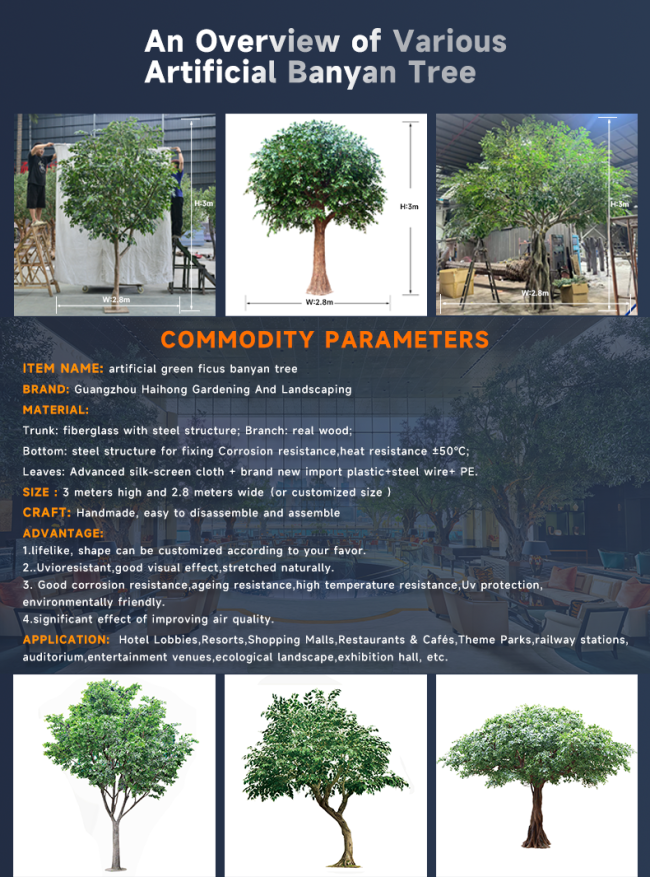 Introducing our premium Artificial Green Ficus Banyan Tree, expertly crafted by Guangzhou Haihong Gardening And Landscaping. This stunning 3-meter high, 2.8-meter wide artificial tree (custom sizes available) combines lifelike beauty with unmatched durability.