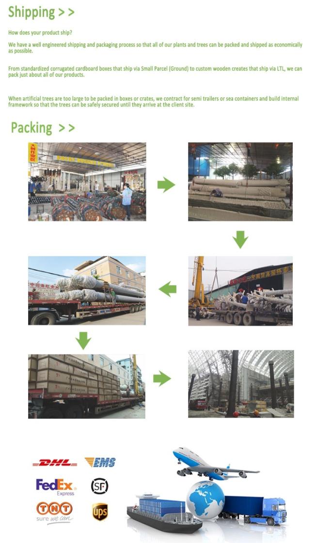 We have a well-engineered shipping and packaging process so that all of our plants and trees can be packed and shipped as economically as possible. From standardized corrugated cardboard boxes that ship via Small Parcel (Ground) to custom wooden creates that ship via LTL, we can pack just about all of our products. When artificial trees are too large to be packed in boxes or crates, we contract for semi trailers or sea containers and build internal framework so that the trees can be safely secured until they arrive at the client site.