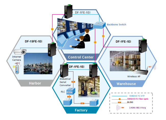With stable performance of data transmission and easy installation, the DF-1FE-1EI Industrial Media Converter series can build network solution of FTTH (Fiber to the Home), FTTC (Fiber to the Curb) , or FTTB (Fiber to the Building) for enterprises with small office network environment.