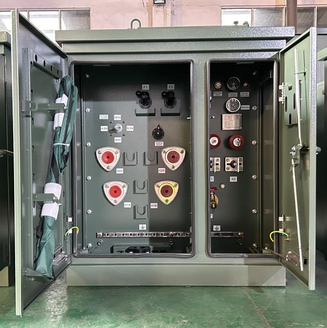 This 15 kVA Single phase pad mounted transformer compartmental liquid‑filled transformer features a sealed mineral‑oil (ONAN) tank with separate lockable HV and LV compartments, easy maintenance and reliable outdoor distribution performance.