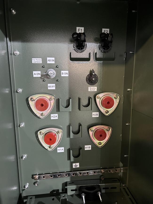 This is 15 kVA Single phase pad-mounted transformer features a 6600 V delta primary and 120 V secondary, Designed for pad installation with bottom underground cable entry, it includes load‑break elbows, a 200 A load‑break switch, a 5‑position tap changer, HV and LV surge arresters, fused HV protection, and accessible front compartments with padlockable doors.