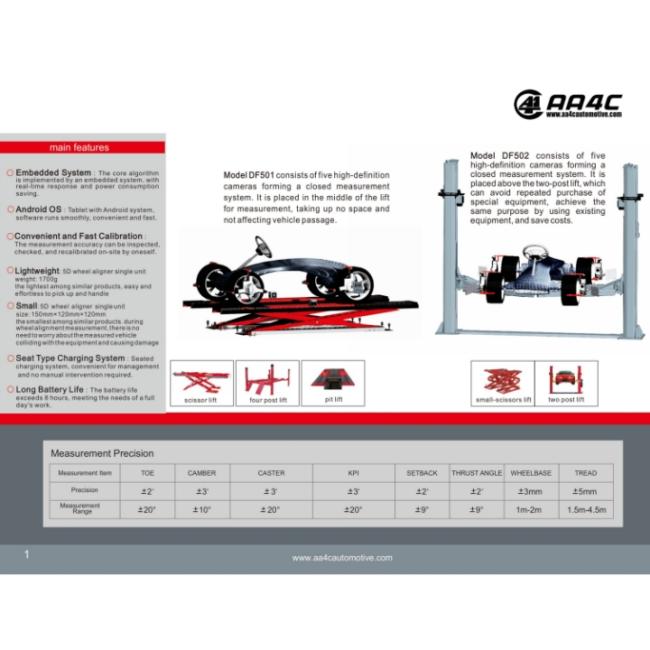 | Keywords | AA4C DF501 3D wheel alignment machine 5 cameras no camera beam no cabinet no monitor no computer be applicable to scissor lift, four post lift and pit. | up/down mode | manually |
