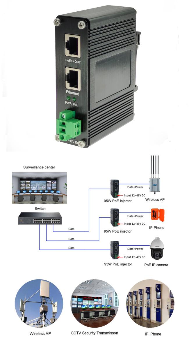 Hardened Gigabit 1-port Ethernet Input + 1-port 95W PoE++ Output Injector with 12~48V DC wide range power input |