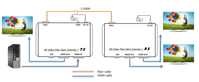 ► Transmits DVI video signals up to 2km-10km over one fiber optic cable;