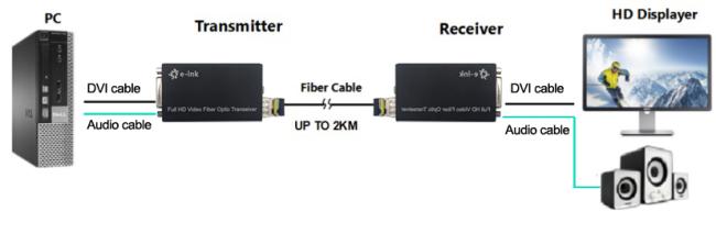 Transmits uncompressed DVI video signals and external stereo audio over a single fiber optic cable for distances up to 20km, enabling flexible system layout far beyond copper cable limitations.